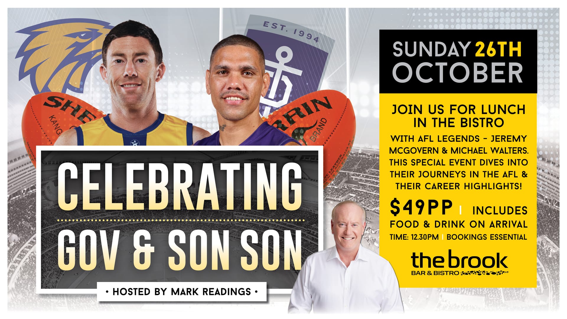 Enjoy a delicious food and drink package as AFL greats Jeremy McGovern and Michael Walters takes the mic to share insights from their incredible careers!