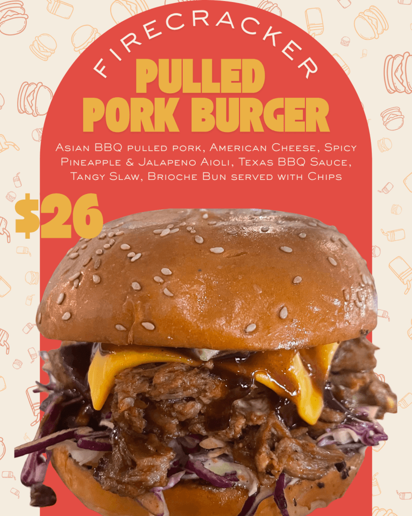 Introducing the Firecracker Pulled Pork Burger! Asian BBQ pulled pork, American Cheese, spicy pineapple & jalapeno aioli, Texas BBQ sauce, tangy slaw, brioche bun served with chips.